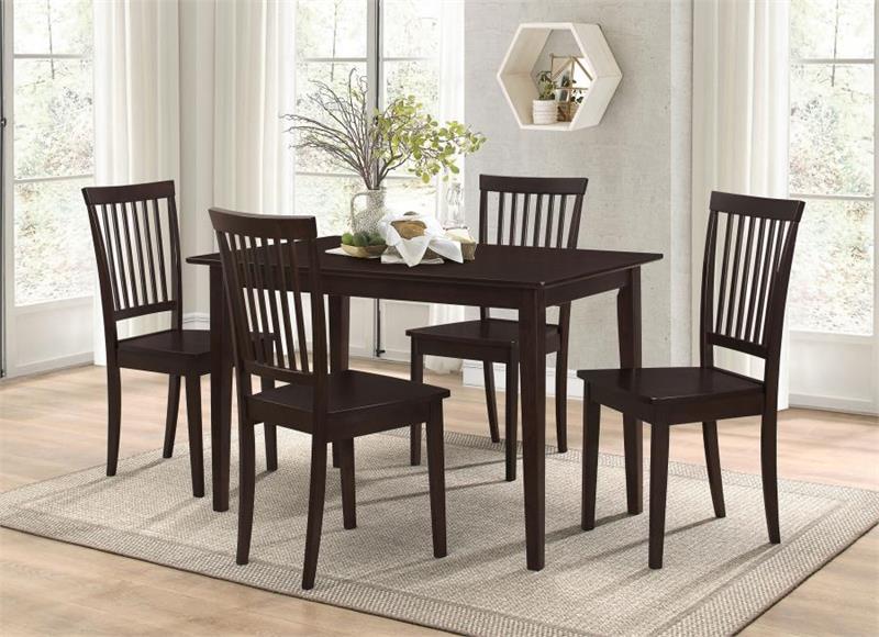 Go all-in on a classic motif with this five-piece dining set. Full of clean lines, the table features a rectangular silhouette with straight edges and square tapered legs. Elegant in style, the side chairs are complete with vertical slat backs that honor timeless design. Contoured wooden seats help to create comfort. Rich and warm, the cappuccino finish puts the finishing touch on a traditional dining room.