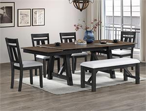 Transform your dining space with this stunning blend of rustic charm and modern elegance. Featuring a rich two-tone finish, the dual draw leaf tabletop beautifully contrasts with the deep, bold base, creating a striking yet inviting aesthetic. The trestle-style table offers both stability and timeless appeal, making it perfect for family gatherings or intimate dinners. Complementing the table, the matching chairs and bench feature upholstered seats for added comfort, while the slatted chair backs enhance the design with a contemporary touch. Whether hosting guests or enjoying everyday meals, this set delivers style, durability, and a welcoming atmosphere.