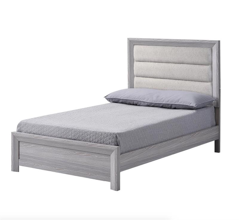 This bedroom set is the embodiment of understated sophistication, featuring a neutral drift wood finish that complements its clean and contemporary design. The robust bed frame anchors the room with a plush channel tufted headboard. Accompanying the bed are coordinating pieces: a dresser with a large mirror, a tall chest for additional storage, and a nightstand to keep essentials within reach. Each piece is crafted with sleek, straight lines and fitted with rectangular cup pulls, creating a cohesive look that’s both modern and timeless.
