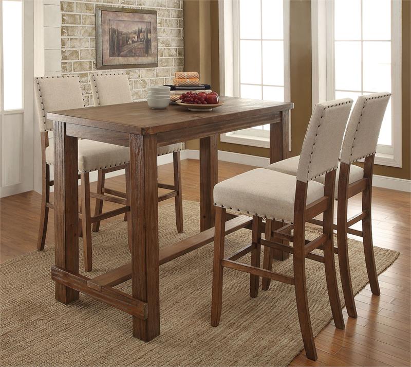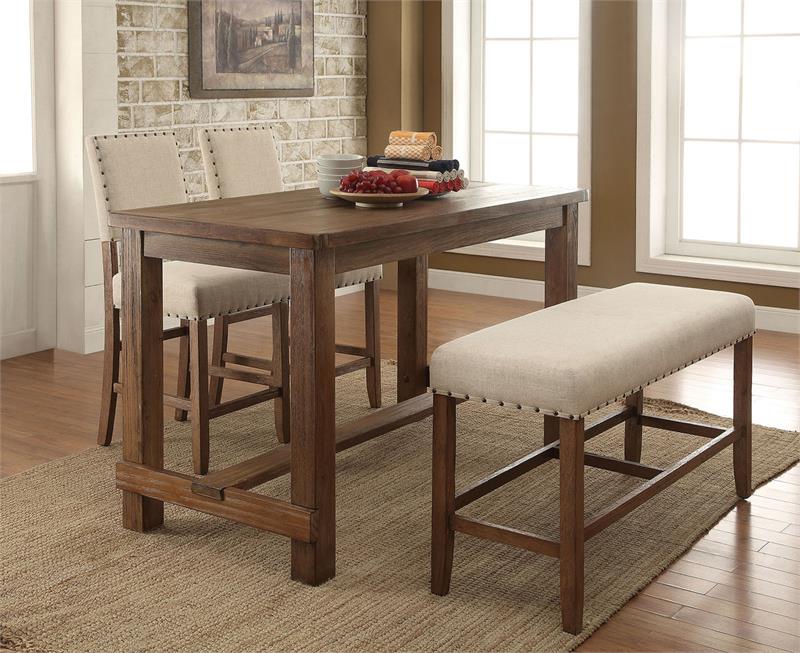 Rustic charm meets upscale design in the form of this stunning collection. The rustic wood grain and antique black finish take you to a charming farmhouse somewhere in the countryside, achieving an inviting, homey atmosphere that will have family and friends coming back for more. Elegant ivory linen-like chairs add sophisticated appeal with their wingback sides, button tufting and nailhead trim.
